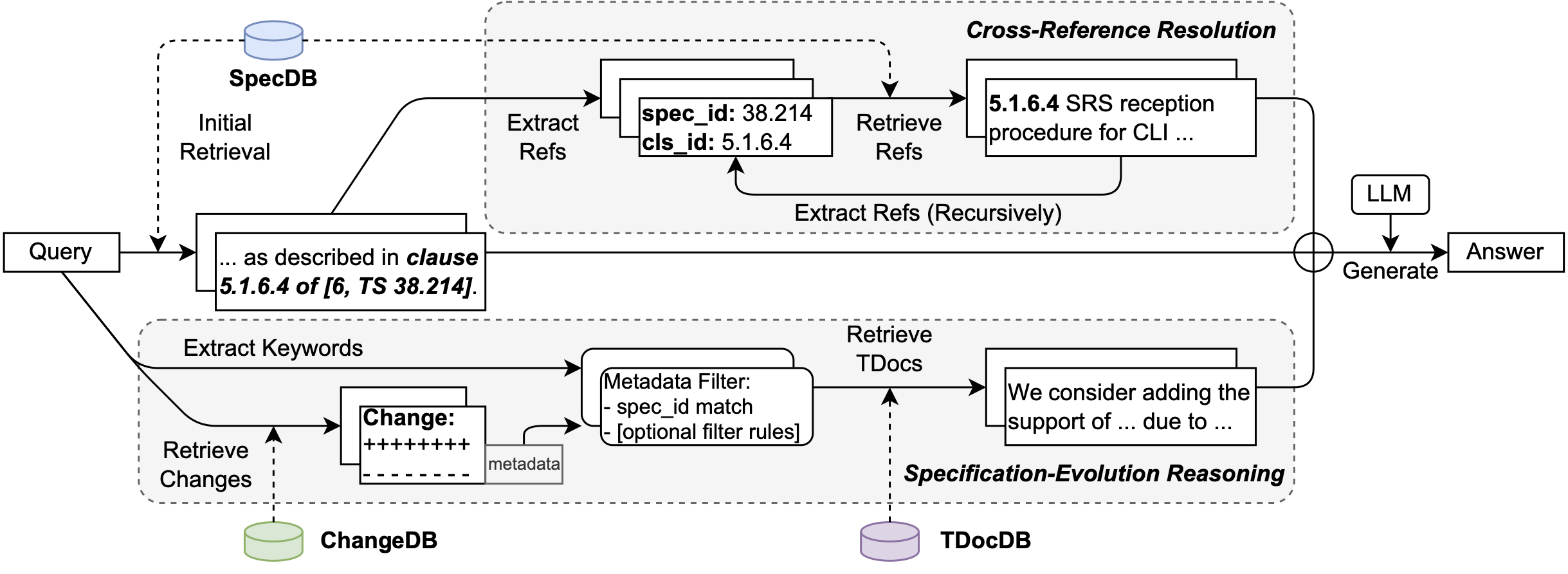 - Specification Evolution Reasoning (SER): Analyzes questions for version-related queries, searches ChangeDB for relevant diffs, and uses these to generate metadata filters for TDocDB searches to retrieve k3 documents about feature evolution